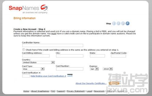 第一步:注冊 - 下圖是第四步,必須要填信用卡信息。不過如果沒有搶注成功,snapnames是不會給你扣款的。