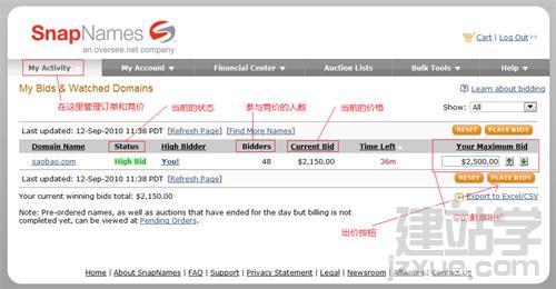第三步:等待結果 - PLACE ORDER之后可以在My Activity中找到這個訂單,然后就是等待系統搶注了。一般com,net,org都是在晚上凌晨2點到3點左右刪除。大家完全沒有必要熬夜,直接睡覺,第二天察看郵件,如果成功了,競價去吧。如果失敗了,也會給你發一封郵件通知。不過通過whois你一般不能查到是哪個公司注冊,因為都是通過管道來注冊。