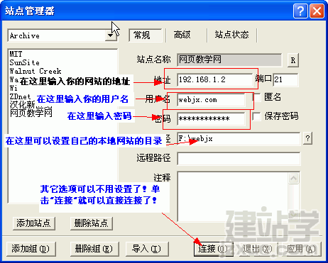 下圖中的本地目錄(也就是只的我們自己電腦中的網(wǎng)站存放的位置,當(dāng)然我們?cè)谧约褐谱骶W(wǎng)頁(yè)的時(shí)候應(yīng)該包含首頁(yè),下面已經(jīng)做了說(shuō)明,具體看你的空間 說(shuō)明支持哪個(gè)文件做為首頁(yè)),遠(yuǎn)程網(wǎng)站的目錄就是你申請(qǐng)的空間的目錄,至于具體上傳到哪個(gè)目錄要看空間提供商的說(shuō)明.看到下圖你就可以分清哪個(gè)"本地目 錄"?哪個(gè)"遠(yuǎn)程目錄"?在我們上傳時(shí)要遵守這個(gè)規(guī)定!如果上傳的網(wǎng)頁(yè)中包含了圖片那么我們也應(yīng)該將圖片上傳到遠(yuǎn)程網(wǎng)站空間中!在這里你就應(yīng)該注意網(wǎng)頁(yè)中 使用的圖片的問(wèn)題了!
