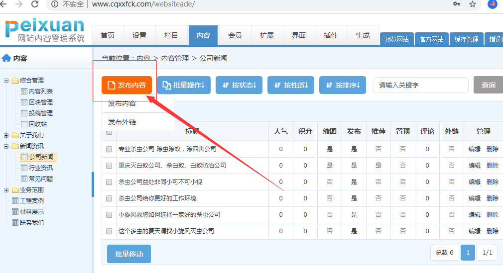 內容增加->新聞類型發布內容時一定要注意、增加的內容增加在什么地方,首先要在左邊選擇增加到內容的欄目,比如要發布新聞,首先要在左邊選擇新聞。再點內容發布按鈕