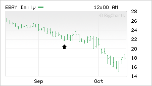 eBay在9月15日時收盤價為22美元,市值268億美元;至11月20日收盤價為11.17美元,市值142.6億美元,市值縮水125億美元,縮水幅度達53%。