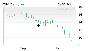 時代華納股價表現圖(箭頭指向處為9月15日當天股價表現)(騰訊科技配圖)