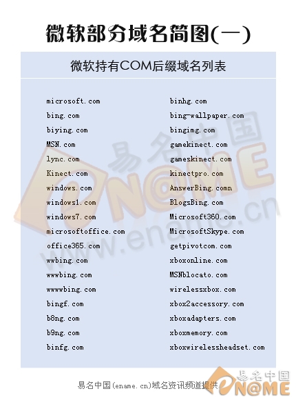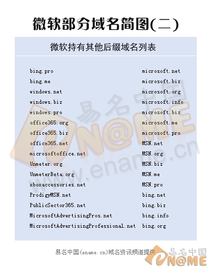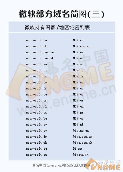 微軟是全球知名大企業,對于其產品保護也較為到位,其旗下眾多的產品名稱很多與國家/地區后綴結緣,microsoft.cn、microsoft.com.cn和microsoft.hk等,值得一提的是,微軟自推出必應搜索引擎之后,便和谷歌在全球范圍內搜索市場相互競爭,谷歌目前在擁有13億人口的中國擁有其CN域名多個,微軟當然也不會示弱,在國內也收購了眾多個CN域名,如biying.cn、bing.com.cn和bing.com.hk等等,可見,國家后綴域名也是微軟重點保護對象。
