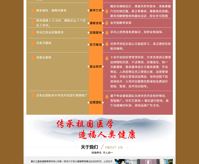 公司本著以提升民眾生命質(zhì)量為使命,為廣大受眾群體提供以“個人疾病風(fēng)險控制,消除健康危險因素”為核心內(nèi)容的系統(tǒng)的健康管理服務(wù)。本著“弘揚中醫(yī)傳統(tǒng)文化”的精神,以“傳播國學(xué)文化,倡導(dǎo)全民健康”為宗旨,發(fā)掘祖國醫(yī)學(xué)養(yǎng)生精髓,傳承祖國醫(yī)學(xué)養(yǎng)生技藝,提供健康管理咨詢、中醫(yī)保健養(yǎng)生、技藝培訓(xùn)以及就業(yè)創(chuàng)業(yè)指導(dǎo)等服務(wù)。